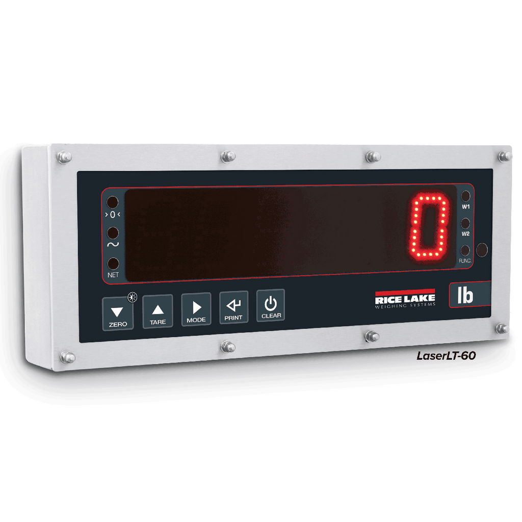Use the LaserLT-60 and LaserLT-100 remote displays to clearly display weight information at distances up to 150 feet. The displays are ideal for applications where weight needs to be viewed from a distance. Both the LaserLT-60 and the LaserLT-100 operate with a range of weight indicators to easily integrate with any system. The incoming format can be interfaced through a set function or with a manual setup. The LaserLT-60 and LaserLT-100 are designed for indoor, outdoor and washdown applications. With adjustable brightness, the six-digit, seven-segment character LED displays are easy to read even in direct sunlight. The stainless steel enclosure is weathertight with an IP68 rating. With a standard anti-condensation air valve regulating humidity and pressure, these displays are protected for outdoor use. The LaserLT-60 and LaserLT 100 are easy to mount with standard back brackets. The back brackets have a 15-degree angle for clear visibility from below.